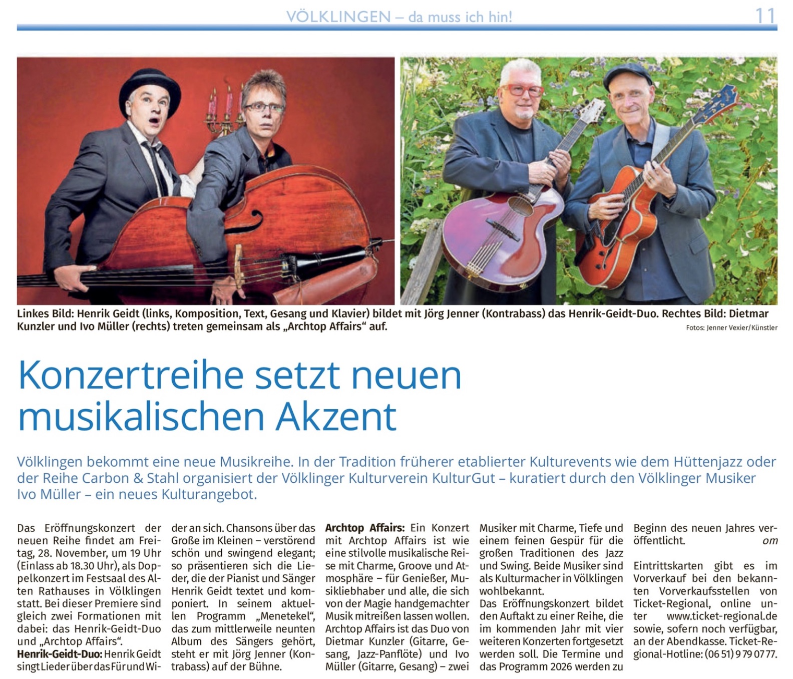 In der Völklinger Beilage der Saarbrücker Zeitung am 27.11.2025 ist ein schöner Beitrag zum Auftaktkonzert der neuen Kulturreihe veröffentlicht worden: