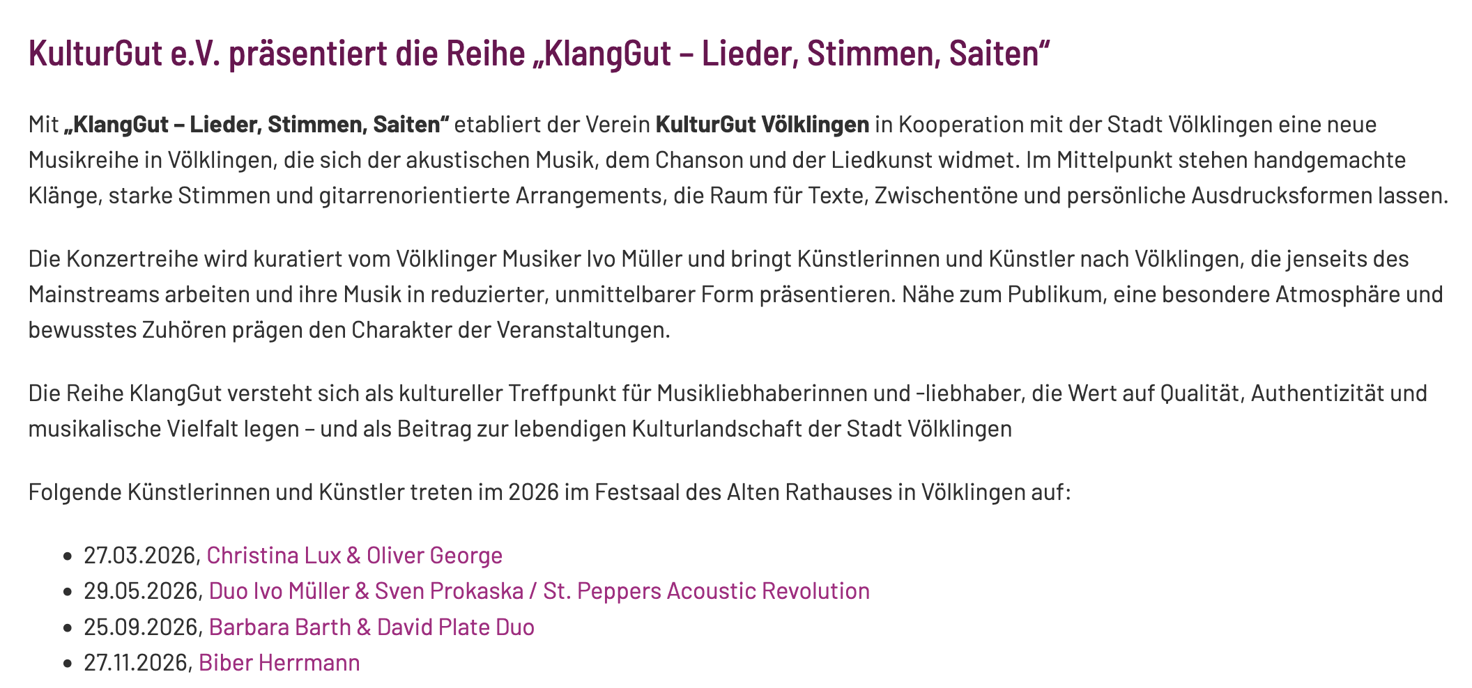 Der Völklinger Verein KulturGut e. V. hat eine kleine Nachlese zum Auftaktkonzert seiner neuen Kulturreihe veröffentlicht – Volles Haus, schöne Beiträge, tolle Stimmung.